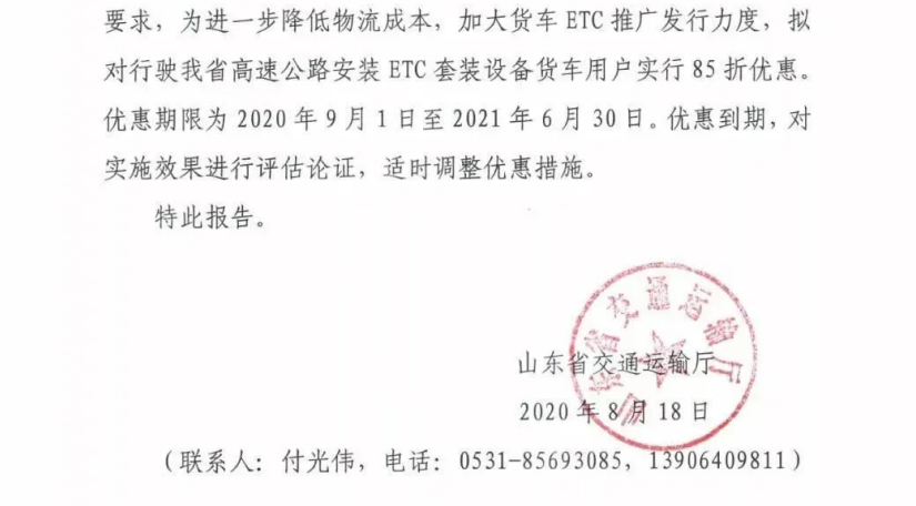山東省表示:為進一步降低物流成本,加大貨車ETC推廣發(fā)行力度,擬對行駛在山東省高速安裝ETC套裝設(shè)備貨車用戶實行85折優(yōu)惠,期限為2020年9月1日至2021年6月30日。