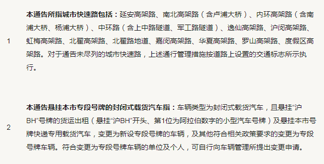 每日11時至13時,本市內(nèi)環(huán)以外的城市快速路(不含內(nèi)環(huán)),允許懸掛本市專段號牌的封閉式載貨汽車通行。